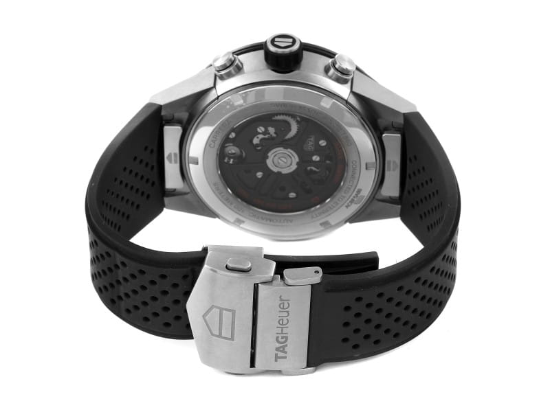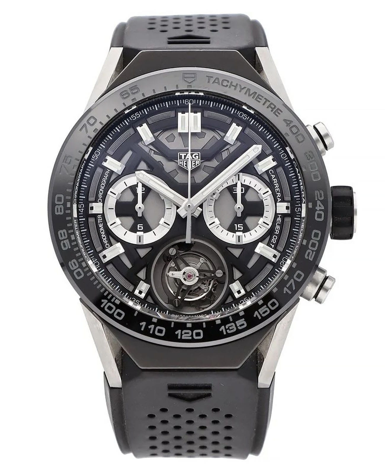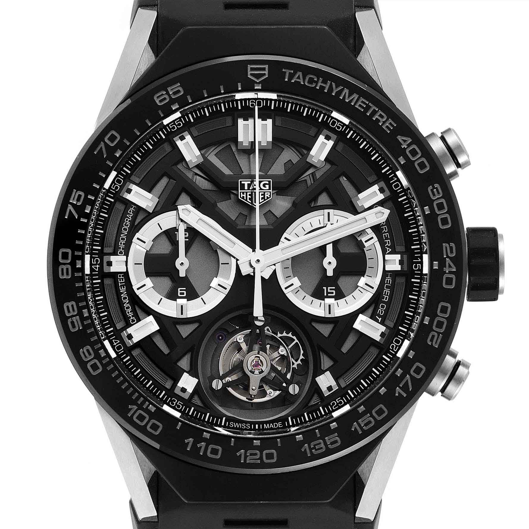 Самая продаваемая версия революционной модели TAG Heuer Carrera Heuer 02 Tourbillon с мгновенно узнаваемым скелетонизированным циферблатом и титановым корпусом. Каждый экземпляр часов подвергается интенсивным испытаниям в течение трех недель, чтобы подтвердить соответствие строгим стандартам точности хронометров, разработанными швейцарским агентством по сертификации COSC. Швейцарские мужские часы-хронографХронографФункция позволяет измерять отрезки времени с особой точностью: часы, минуты, секунды. Верным признаком хронографа является наличие на циферблате 3 дополнительных окошек-счётчиков. TAG Heuer Carrera ACBF5A80, механический механизм (автоматический калибр) с высокой точностью. Сапфировое стеклоСапфировое стеклоПрочный и надёжный материал из кристалла сапфира синтетического происхождения, характеризующийся особой твёрдостью и устойчивостью к царапинам и повреждениям. устойчивое к появлению царапин, обладающее высокой прозрачностью. Класс водозащиты: 100 метров, позволит плавать, нырять и заниматься другими водными видами спорта. Корпус часов изготовлен из керамики, с PVDPVDУльтратонкое покрытие наносится в технике вакуумного напыления, сочетает в себе нитрид титана особой прочности со слоем золота или оксида хрома. Несёт в себе декоративную или защитную функцию. покрытием черного цвета.