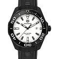 TAG Heuer Aquaracer WAY108A.FT6141 — элегантные мужские часы, сочетающие современный дизайн и высокую функциональность. Корпус диаметром 43 мм выполнен из титана с PVD-покрытиемPVDУльтратонкое покрытие наносится в технике вакуумного напыления, сочетает в себе нитрид титана особой прочности со слоем золота или оксида хрома. Несёт в себе декоративную или защитную функцию. чёрного цвета, обеспечивающим лёгкость и прочность. Белый циферблат с часовыми метками и стрелками, покрытыми люминесцентным покрытиемЛюминесцентное покрытиеПозволяет считывать показания времени в темноте. Производители наносят на стрелки, часовые индексы, безель или поверхность циферблата светонакопительный состав, дающий холодное свечение., гарантирует отличную читаемость в любых условиях освещения. Часы оснащены точным кварцевым механизмом, обеспечивающим стабильное отображение времени. Функциональность включает индикацию часов, минут, секунд и даты, расположенной на отметке «3 часа». Сапфировое стеклоСапфировое стеклоПрочный и надёжный материал из кристалла сапфира синтетического происхождения, характеризующийся особой твёрдостью и устойчивостью к царапинам и повреждениям. обеспечивает надёжную защиту от царапин и превосходную читаемость. Чёрный каучуковый ремешок оснащён раскладной застёжкойРаскладная застёжкаТакой тип застёжки используется только на браслетах из металла. Она никогда не раскрывается полностью, происходит разделение на 2 и более частей. Раскладывающая застёжка снизит вероятность потери часов к минимуму. из титана с PVD-покрытиемPVDУльтратонкое покрытие наносится в технике вакуумного напыления, сочетает в себе нитрид титана особой прочности со слоем золота или оксида хрома. Несёт в себе декоративную или защитную функцию. и двойными предохранительными кнопками. Водозащита до 300 метров (30 бар) делает модель идеальной для дайвинга и активного образа жизни.