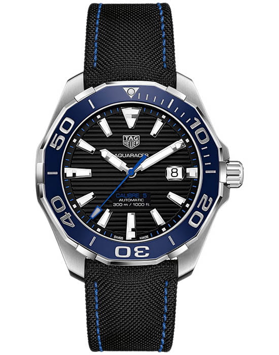 TAG Heuer Aquaracer WAY201C.FC6395 — стильные и надёжные часы, созданные для активного образа жизни и водных приключений. Корпус диаметром 43 мм выполнен из нержавеющей стали с чередующейся полированной и матовой отделкой, что придаёт модели современный и динамичный вид. Однонаправленный вращающийся безельБезельВнешний ободок, закрепляющий стекло. В спортивных часах так называется поворотное кольцо с делениями на циферблате, выполняет роль таймера – замеряет отрезки времени на шкале. Неподвижный безель – элемент декора. Однонаправленно вращающийся безель на дайверских часах позволяет фиксировать моменты погружения и выныривания на поверхность. с синей керамической вставкой оснащён минутной разметкой и светящимся маркером на позиции «12 часов», обеспечивая удобство при отсчёте времени погружения. Чёрный циферблат с вертикальным гильоше дополнен накладными часовыми индексами и стрелками с люминесцентным покрытиемЛюминесцентное покрытиеПозволяет считывать показания времени в темноте. Производители наносят на стрелки, часовые индексы, безель или поверхность циферблата светонакопительный состав, дающий холодное свечение., что гарантирует отличную читаемость в любых условиях освещения. Окошко даты с увеличительным стеклом расположено на отметке «3 часа» для удобства. Защиту циферблата обеспечивает сапфировое стеклоСапфировое стеклоПрочный и надёжный материал из кристалла сапфира синтетического происхождения, характеризующийся особой твёрдостью и устойчивостью к царапинам и повреждениям. с антибликовым покрытиемАнтибликовое покрытиеСлой оксида металла в 0,13-0,3 микрон, благодаря которому стекло часов не бликует и не отражает свет. Антибликовое покрытие уменьшает отражение света в 10 раз, обеспечивая отличную читаемость показателей циферблата.. Внутри установлен швейцарский автоматический механизм Calibre 5, обеспечивающий точность хода и запас энергии до 38 часов. Часы укомплектованы чёрным нейлоновым ремешком с кожаной подкладкой, а раскладная застёжкаРаскладная застёжкаТакой тип застёжки используется только на браслетах из металла. Она никогда не раскрывается полностью, происходит разделение на 2 и более частей. Раскладывающая застёжка снизит вероятность потери часов к минимуму. с двойной блокировкой гарантирует надёжную фиксацию на запястье. Водонепроницаемость 300 метров делает модель идеальным выбором для занятий водными видами спорта, включая дайвинг.