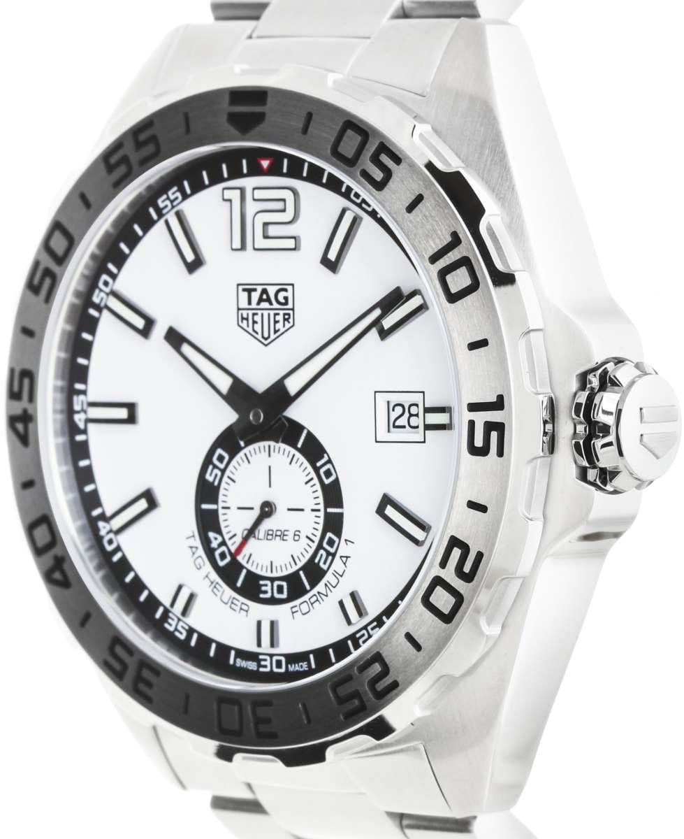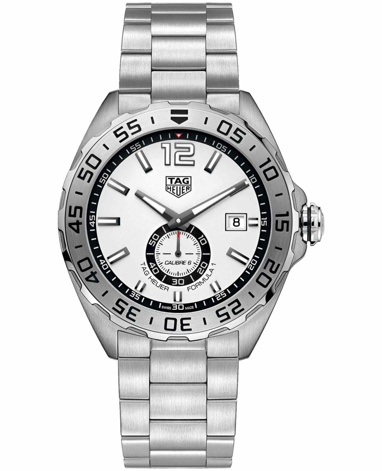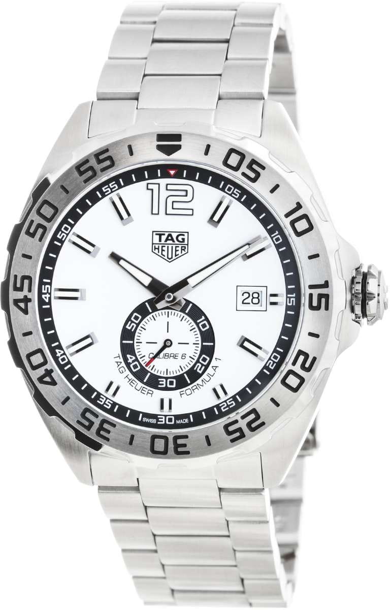 Швейцарские мужские часы TAG Heuer Formula 1 WAZ2013.BA0842 созданы под влиянием мира автоспорта и сочетают в себе скорость, выносливость и отвагу. Прочный корпус из нержавеющей стали с матовой шлифовкой и вращающимся безелем добавляет функциональности для точного отсчета времени. Механизм Tag Heuer Calibre 6 — это автоматический механизм с автоподзаводом, работающий от движения руки, запас хода составляет до 42 часов, частота колебаний баланса достигает 28,800 пк/час, количество рубинов — от 27 до 31. Циферблат с эффектной шлифовкой «sunray» (солнечные лучи) украшен аппликациями цифр и индексов, стрелки с покрытием родием и глянцевой полировкой имеют люминесцентное покрытиеЛюминесцентное покрытиеПозволяет считывать показания времени в темноте. Производители наносят на стрелки, часовые индексы, безель или поверхность циферблата светонакопительный состав, дающий холодное свечение., что позволяет легко определять время даже в темноте. Окошко даты расположено в положении «3 часа», добавляя функциональности. Сапфировое стеклоСапфировое стеклоПрочный и надёжный материал из кристалла сапфира синтетического происхождения, характеризующийся особой твёрдостью и устойчивостью к царапинам и повреждениям. с антибликовым покрытием защищает циферблат от царапин и повреждений, сохраняя четкость показаний в любых условиях. Литой браслет из нержавеющей стали с тремя рядами звеньев оснащен раскладывающейся застежкойРаскладная застёжкаТакой тип застёжки используется только на браслетах из металла. Она никогда не раскрывается полностью, происходит разделение на 2 и более частей. Раскладывающая застёжка снизит вероятность потери часов к минимуму. с системой удлинения для ношения поверх дайверского гермокостюма заводная коронка с винтовой фиксацией обеспечивает дополнительную защиту механизма. Задняя крышка с гравировкой имеет резьбовое соединение с корпусом часы обладают высокой водонепроницаемостью, что делает их подходящими для активного образа жизни, включая плавание и ныряние.