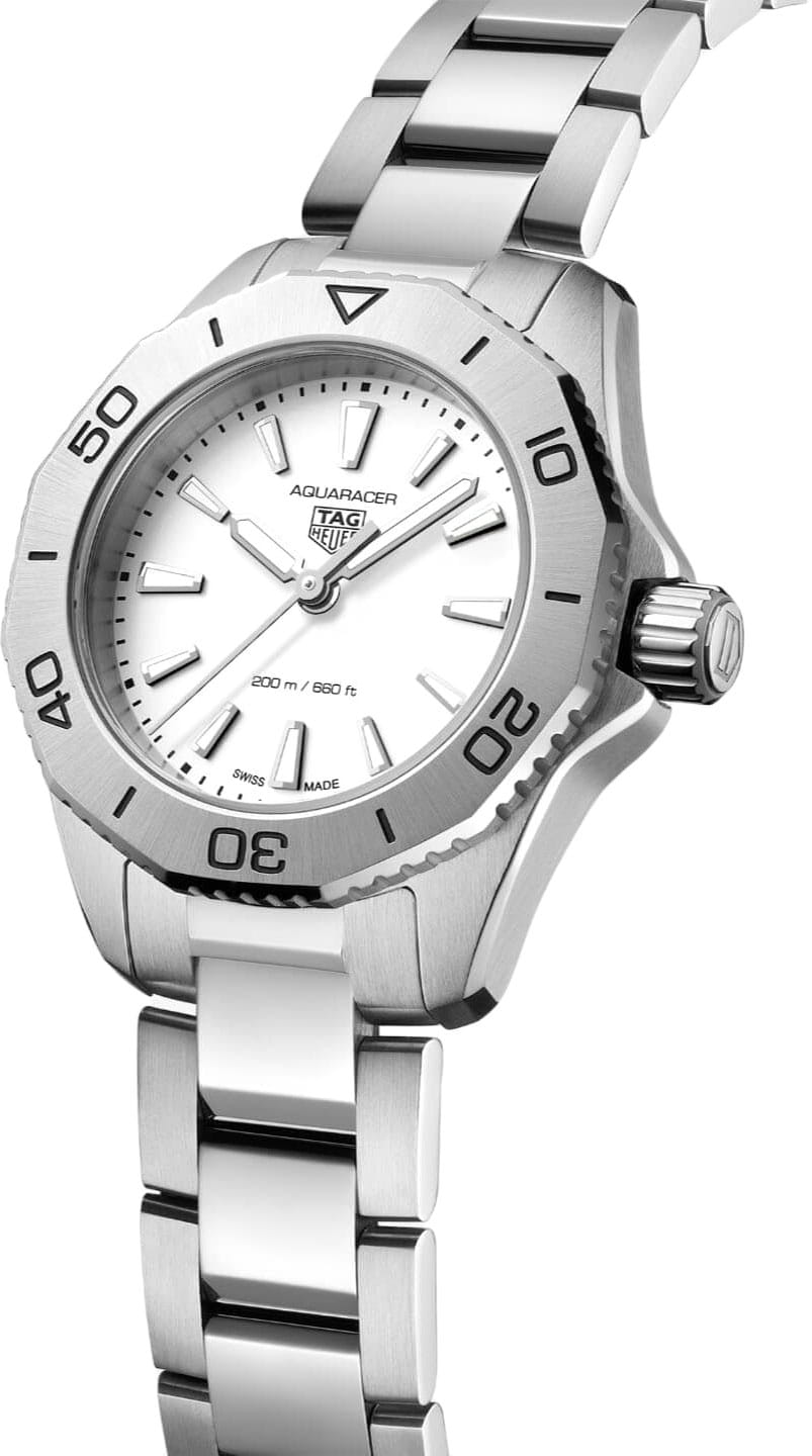 Женские швейцарские часы TAG Heuer Aquaracer Professional 200 WBP1411.BA0622, кварцевый механизм с высокой точностью. Сапфировое стеклоСапфировое стеклоПрочный и надёжный материал из кристалла сапфира синтетического происхождения, характеризующийся особой твёрдостью и устойчивостью к царапинам и повреждениям. устойчивое к появлению царапин, обладающее высокой прозрачностью. Класс водозащиты: 200 метров, позволит плавать, нырять и заниматься другими водными видами спорта. Корпус часов изготовлен из стали. Стальной браслет на раскладной застёжкеРаскладная застёжкаТакой тип застёжки используется только на браслетах из металла. Она никогда не раскрывается полностью, происходит разделение на 2 и более частей. Раскладывающая застёжка снизит вероятность потери часов к минимуму.. Стальной рифленый вращающийся 12-гранный безельБезельВнешний ободок, закрепляющий стекло. В спортивных часах так называется поворотное кольцо с делениями на циферблате, выполняет роль таймера – замеряет отрезки времени на шкале. Неподвижный безель – элемент декора. Однонаправленно вращающийся безель на дайверских часах позволяет фиксировать моменты погружения и выныривания на поверхность. с минутной шкалой выполнен с радиальным сатинированием поверхности. Циферблат выполнен по технологии Sunray (солнечные лучи). Метки в виде штрихов. Стрелки и метки с родиевым и люминесцентным покрытиемЛюминесцентное покрытиеПозволяет считывать показания времени в темноте. Производители наносят на стрелки, часовые индексы, безель или поверхность циферблата светонакопительный состав, дающий холодное свечение. Superluminova. Рифленая заводная головка с защитой. Задняя крышка украшена выгравированной 8-лучевой розой ветров на фоне узора сотовой структуры.