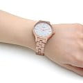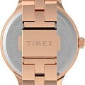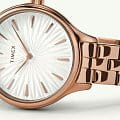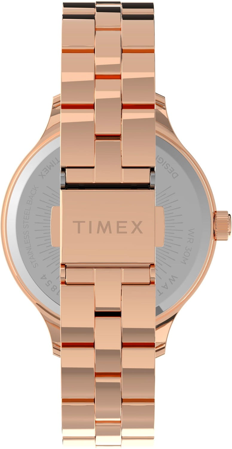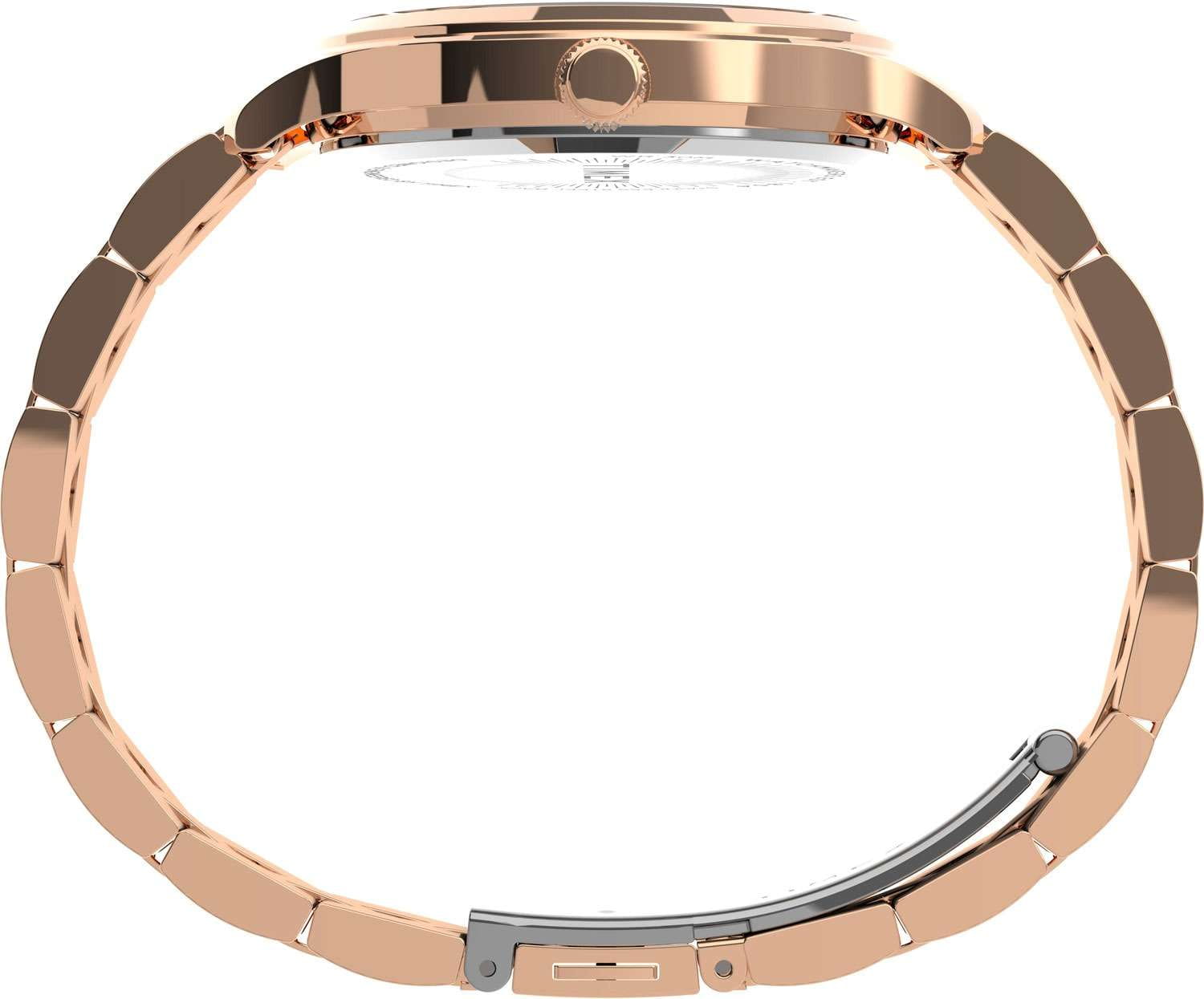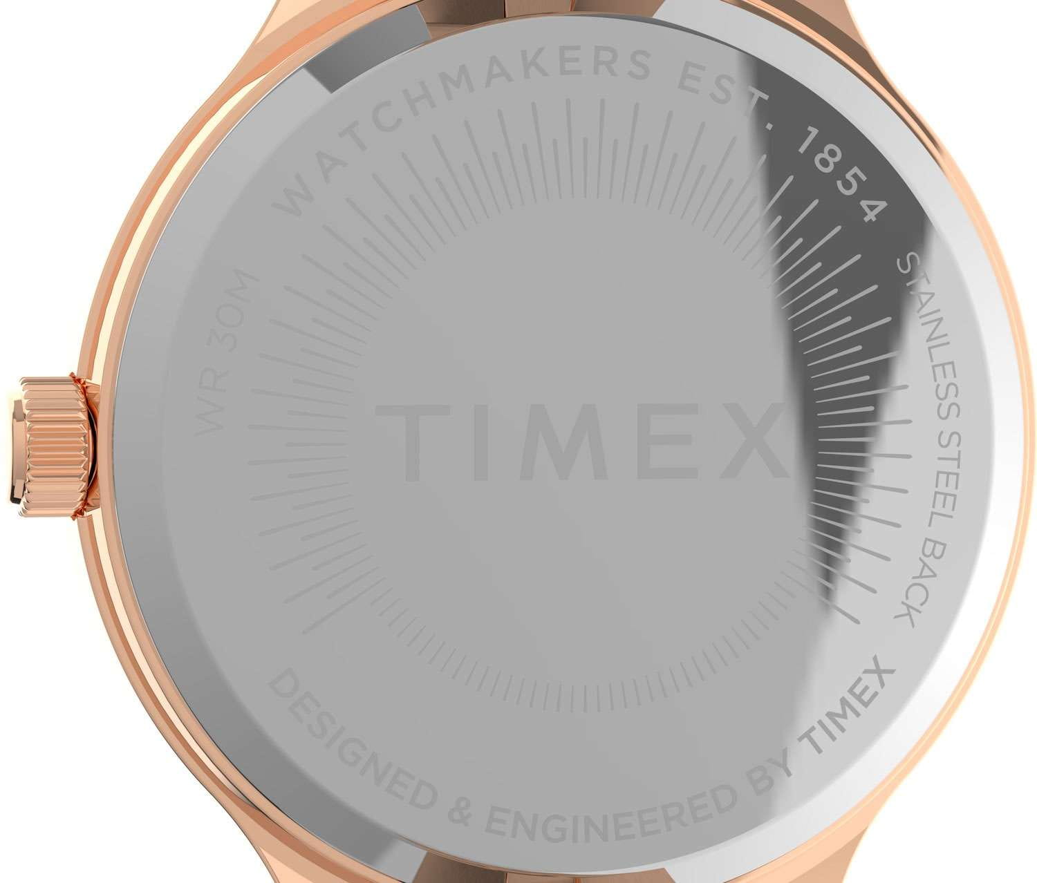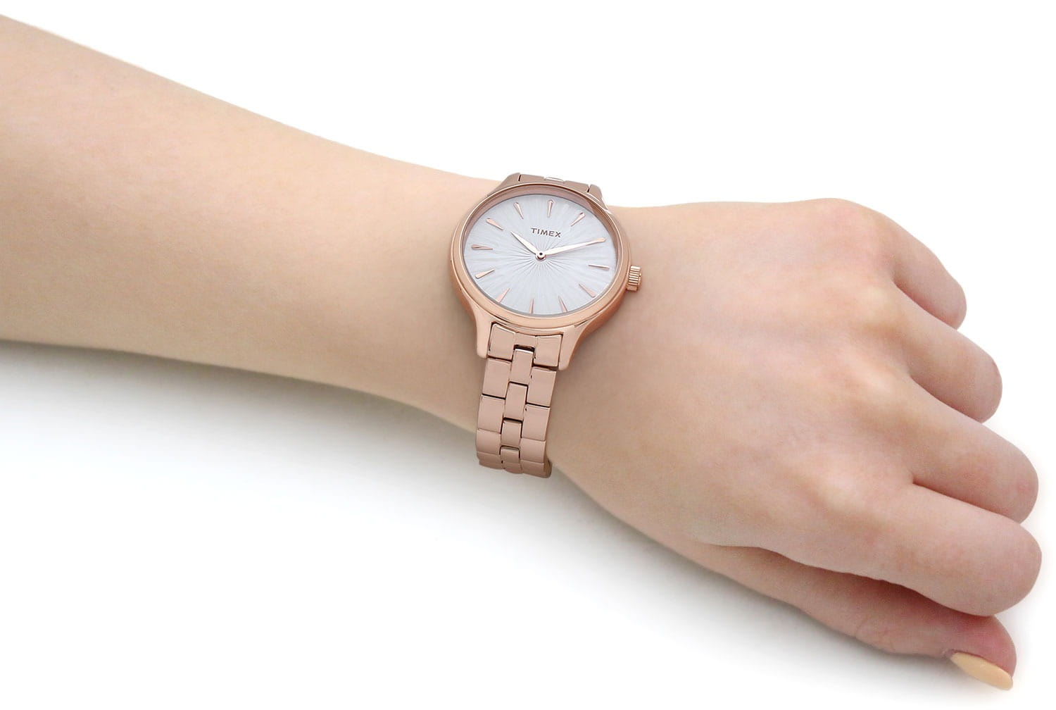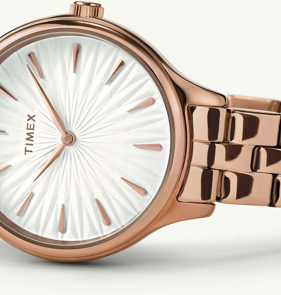 Наручные часы Timex TW2V06300 — это изящный аксессуар, который подчеркнет превосходный вкус своей обладательницы. Изготовленные в США, эти практичные женские часы оснащены надежным кварцевым механизмом, обеспечивающим точность хода. Корпус часов выполнен из латуни с розовым PVDPVDУльтратонкое покрытие наносится в технике вакуумного напыления, сочетает в себе нитрид титана особой прочности со слоем золота или оксида хрома. Несёт в себе декоративную или защитную функцию. покрытием, которое придает изделию изысканный и современный вид. Белый циферблат украшен рельефным декоративным узором и оснащен листовидными стрелками в стиле Feuille, что обеспечивает элегантный внешний вид. Метки в виде штрихов и отсутствие секундной стрелки придают модели минималистичный стиль. Часы оснащены рифленой заводной головкой и надежным стальным браслетом с розовым PVDPVDУльтратонкое покрытие наносится в технике вакуумного напыления, сочетает в себе нитрид титана особой прочности со слоем золота или оксида хрома. Несёт в себе декоративную или защитную функцию. покрытием, который имеет раскладную застёжкуРаскладная застёжкаТакой тип застёжки используется только на браслетах из металла. Она никогда не раскрывается полностью, происходит разделение на 2 и более частей. Раскладывающая застёжка снизит вероятность потери часов к минимуму. для комфортной посадки на запястье. Водозащита 30WR позволяет носить часы в различных условиях, защищая их от случайных брызг. Минеральное стеклоМинеральное стеклоМинеральное стекло представляет собой искусственно выращенный минерал кварца. Такое стекло отличается особой устойчивостью к повреждениям и царапинам. Уступает по некоторым качествам сапфировому стеклу. защищает циферблат от царапин и повреждений, сохраняя его первозданный вид. Размеры корпуса составляют 36 мм в диаметре, а ширина браслета — 14 мм, что делает часы элегантными и подходящими для любого случая.