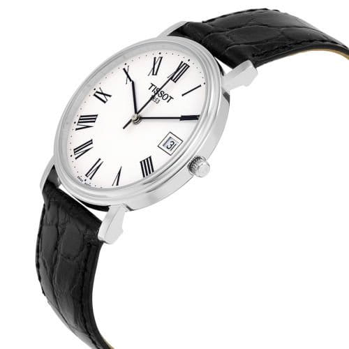 TISSOT T52142113 T-Classic Desire Quartz - мужские кварцевые наручные часы Корпус этих часов небольшого размера (34 мм) и выполнен из нержавеющей стали L316 металлического цвета Модель TISSOT T52142113 T-Classic Desire Quartz имеет устойчивое к царапинам сапфировое стекло, ремешок из натуральной кожи черного цвета, белый циферблат Калибр механизма: ETA F06111 Класс водозащиты: 30 м / 3 АТМ (защита от брызг и случайных капель) Дополнительные функции и особенности: отображение числа Полная заводская комплектация TISSOT: оригинальные часы, фирменная коробка, инструкция, сервисная книжка, роман о часовой фабрике, миникаталог, замшевый фирменный чехол черного цвета для хранения и/или переноски часов, кассовый и товарный чеки Международная гарантия 2 года Производство и сборка: Швейцария