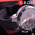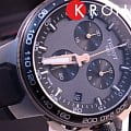 На чёрном циферблате расположились крупные золотистые стрелки, а также миниатюрные счётчики хронографаХронографФункция позволяет измерять отрезки времени с особой точностью: часы, минуты, секунды. Верным признаком хронографа является наличие на циферблате 3 дополнительных окошек-счётчиков.. Крупный безельБезельВнешний ободок, закрепляющий стекло. В спортивных часах так называется поворотное кольцо с делениями на циферблате, выполняет роль таймера – замеряет отрезки времени на шкале. Неподвижный безель – элемент декора. Однонаправленно вращающийся безель на дайверских часах позволяет фиксировать моменты погружения и выныривания на поверхность. дополнен тахиметрической шкалойТахиметрРазмеченная шкала, располагается на ободке или безеле часов. Тахиметр позволяет рассчитать скорость на определённом участке пути, расстояние измеряется в километрах или милях., общее исполнение модели характеризуется как броское, стильное, эпатажное. Отсылкой к велоспорту стала кнопка управления хронографом, напоминающая рукоятку тормоза, на задней крышке корпуса можно увидеть оригинальную гравировку. Швейцарский кварцевый механизм ETA G10.212. Корпус с чёрным PVD-покрытиемPVDУльтратонкое покрытие наносится в технике вакуумного напыления, сочетает в себе нитрид титана особой прочности со слоем золота или оксида хрома. Несёт в себе декоративную или защитную функцию. и PVD-покрытием цвета розового золота. Силиконовый ремешок с водоотталкивающими свойствами. Индикация числа, секундомер. Габариты: 44,5 x 44,5 x 11,4 мм.
