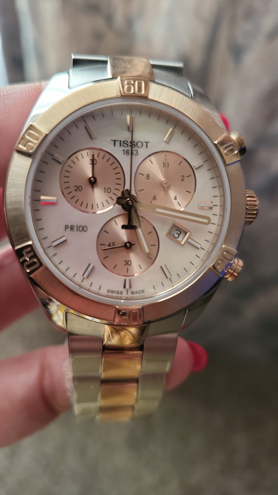 Спортивные элементы дизайна переплетаются с классическими, весьма женственно выглядят нежно-розовые счётчики и стрелки. Модель и центральный ряд звеньев браслета имеют PVD-покрытиеPVDУльтратонкое покрытие наносится в технике вакуумного напыления, сочетает в себе нитрид титана особой прочности со слоем золота или оксида хрома. Несёт в себе декоративную или защитную функцию. корпуса в цвете розового золота. Кварцевый калибр ETA G15.212 обеспечивает высокую точность хода. Водонепроницаемость при давлении 10 бар. Безопасная застёжка не допустит случайное расстёгивание браслета. Окошко даты, секундомер. Габариты: 38 x 38 x 10,5 мм.