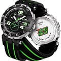 TISSOT - мужские кварцевые наручные часы Корпус этих часов крупного размера (453 мм) и выполнен из нержавеющей стали L316 PVD-покрытием черного цвета Модель имеет устойчивое к царапинам сапфировое стекло, ремешок из натурального каучука черного цвета, черный циферблат Калибр механизма: ETA G10211 Класс водозащиты: 100 м / 10 АТМ (разрешается плавание и ныряние без акваланга) Дополнительные функции и особенности: отображение числа, хронограф (секундомер), тахиметр