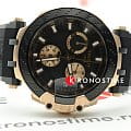 Внешний облик модели был вдохновлён лучшими гоночными мотоциклами. Массивный корпус имеет крупные детали, на чёрном циферблате чётко выделяются золотистые счётчики хронографаХронографФункция позволяет измерять отрезки времени с особой точностью: часы, минуты, секунды. Верным признаком хронографа является наличие на циферблате 3 дополнительных окошек-счётчиков., стрелки и метки с люминесцентным покрытиемЛюминесцентное покрытиеПозволяет считывать показания времени в темноте. Производители наносят на стрелки, часовые индексы, безель или поверхность циферблата светонакопительный состав, дающий холодное свечение.. Динамичный аксессуар позволит заявить о себе в любой ситуации, эксклюзивности добавляет прозрачная задняя крышка в виде колеса. Кварцевый механизм ETA G10.212. Корпус с золотистым PVD-покрытиемPVDУльтратонкое покрытие наносится в технике вакуумного напыления, сочетает в себе нитрид титана особой прочности со слоем золота или оксида хрома. Несёт в себе декоративную или защитную функцию.. Гибкий силиконовый ремешок. Секундомер, отображение текущего числа. Габариты: 47,6 x 43 x 12,3 мм.