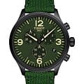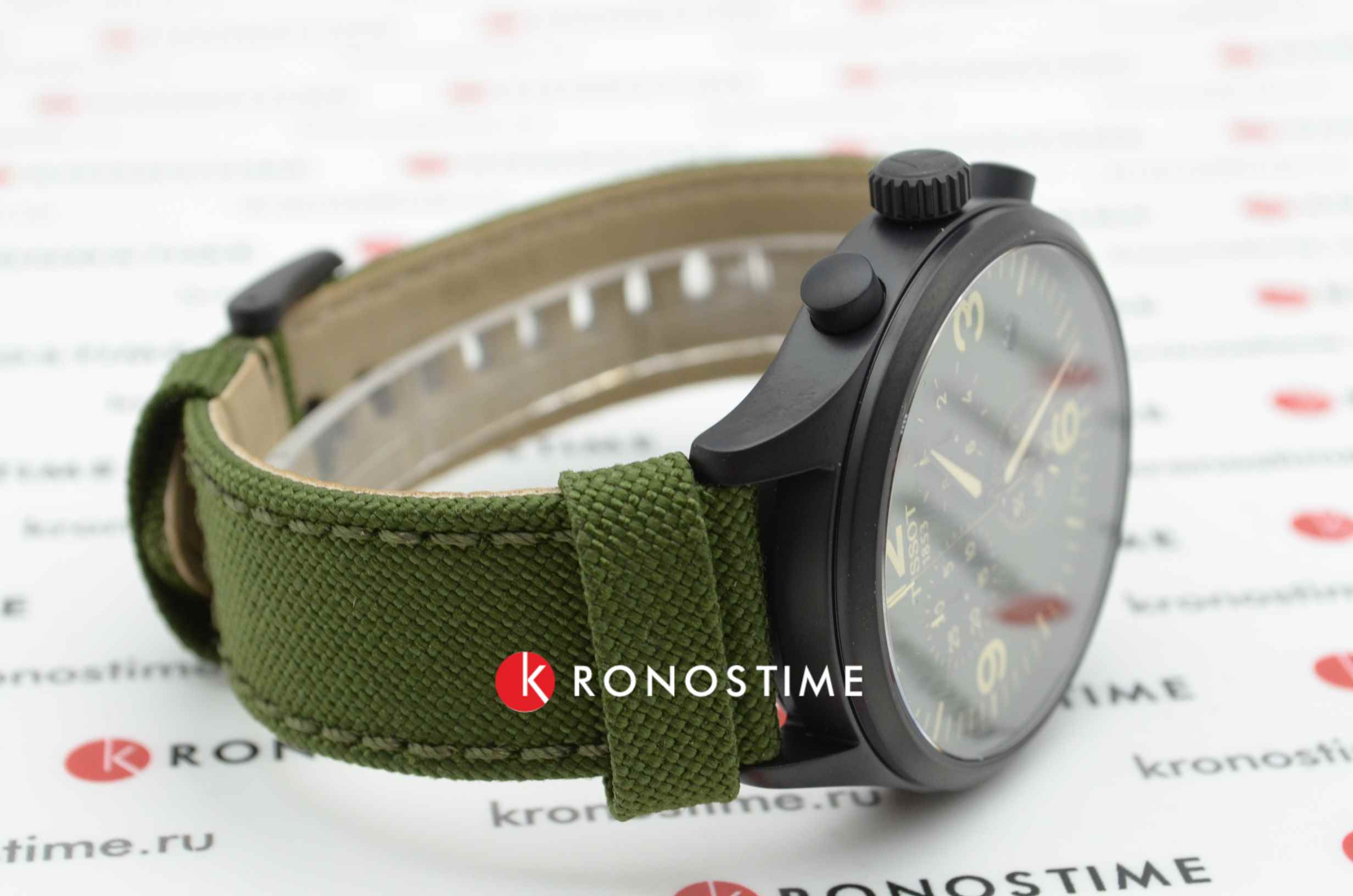 Для классического хронографаХронографФункция позволяет измерять отрезки времени с особой точностью: часы, минуты, секунды. Верным признаком хронографа является наличие на циферблате 3 дополнительных окошек-счётчиков. было выбрано чёрное исполнение, присутствуют контрастные индексы и стрелки. Наручные часы имеют тканевый ремешок NATO зеленого цвета, обеспечивающий невероятный комфорт при ношении. Высокоточный кварцевый механизм ETA G10.212. Люминесцентная подсветкаЛюминесцентное покрытиеПозволяет считывать показания времени в темноте. Производители наносят на стрелки, часовые индексы, безель или поверхность циферблата светонакопительный состав, дающий холодное свечение.. Цветное износоустойчивое PVD-покрытиеPVDУльтратонкое покрытие наносится в технике вакуумного напыления, сочетает в себе нитрид титана особой прочности со слоем золота или оксида хрома. Несёт в себе декоративную или защитную функцию. корпуса. Сапфировое стекло. Водонепроницаемость до 10 бар. Окошко даты, секундомер. Габариты: 45 x 45 x 11 мм.
