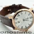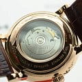 Изяществом привлекает минималистичным циферблатом с римскими цифрами, золотистого оттенка удалось добиться за счёт PVD-покрытияPVDУльтратонкое покрытие наносится в технике вакуумного напыления, сочетает в себе нитрид титана особой прочности со слоем золота или оксида хрома. Несёт в себе декоративную или защитную функцию.. Классическое исполнение модели придётся по душе девушкам, желающим приобрести универсальный аксессуар на все случаи жизни. Это часы с автоматической системой завода от движений руки владелицы, они оснащены швейцарским автоматическим механизмом ETA 2671 с запасом хода до 38 часов. Движение деталей можно просматривать через прозрачную заднюю крышку. Гладкий стальной безельБезельВнешний ободок, закрепляющий стекло. В спортивных часах так называется поворотное кольцо с делениями на циферблате, выполняет роль таймера – замеряет отрезки времени на шкале. Неподвижный безель – элемент декора. Однонаправленно вращающийся безель на дайверских часах позволяет фиксировать моменты погружения и выныривания на поверхность. удерживает сапфировое стекло, устойчивое к царапинам. Ремешок из натуральной опойковой кожи имеет тиснение под кожу крокодила. Степень водостойкости - WR 50. Габариты: 30 x 30 x 9,5 мм.