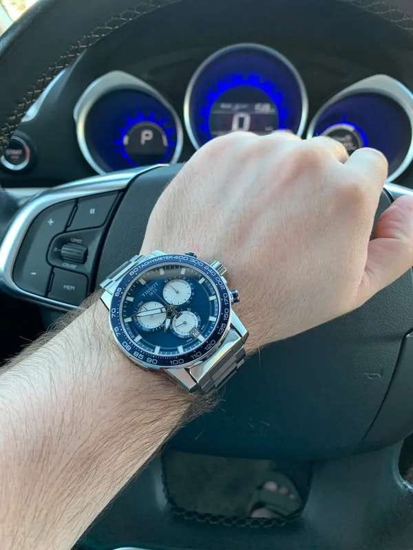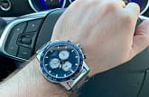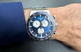 Современный хронографХронографФункция позволяет измерять отрезки времени с особой точностью: часы, минуты, секунды. Верным признаком хронографа является наличие на циферблате 3 дополнительных окошек-счётчиков. поможет подчеркнуть продуманный образ делового мужчины. Модель выполнена в спокойной серебристо-синей расцветке. Наручные часы функционируют благодаря швейцарскому кварцевому механизму. Калибр отличается максимальной точностью хода. Водостойкость 100 метров. Надёжный корпус из антикоррозионной стали 316L. Люминесцентная подсветкаЛюминесцентное покрытиеПозволяет считывать показания времени в темноте. Производители наносят на стрелки, часовые индексы, безель или поверхность циферблата светонакопительный состав, дающий холодное свечение. стрелок и индексов. Отображение даты. Диаметр корпуса: 45,5 мм.