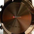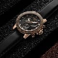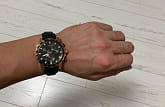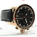 Аксессуар позволит грамотно дополнить образ, гармония чёрно-золотистой палитры никогда не потеряет актуальности. Наручные часы позволят всегда находиться в центре внимания. Массивный циферблат с крупной индикацией времени, симметричным расположением окошек – важная деталь для делового мужчины, привыкшего всё делать вовремя. Ремешок из тисненой натуральной кожи имеет белую прострочку, вдохновение идет от спортивных моделей. Швейцарский кварцевый механизм ETA G10.212. Сапфировое стекло. Корпус из нержавеющей стали 316L с цветным PVD-покрытиемPVDУльтратонкое покрытие наносится в технике вакуумного напыления, сочетает в себе нитрид титана особой прочности со слоем золота или оксида хрома. Несёт в себе декоративную или защитную функцию.. БезельБезельВнешний ободок, закрепляющий стекло. В спортивных часах так называется поворотное кольцо с делениями на циферблате, выполняет роль таймера – замеряет отрезки времени на шкале. Неподвижный безель – элемент декора. Однонаправленно вращающийся безель на дайверских часах позволяет фиксировать моменты погружения и выныривания на поверхность. размечен шкалой тахиметраТахиметрРазмеченная шкала, располагается на ободке или безеле часов. Тахиметр позволяет рассчитать скорость на определённом участке пути, расстояние измеряется в километрах или милях.. Водонепроницаемость до 10 бар. Люминесцентная подсветкаЛюминесцентное покрытиеПозволяет считывать показания времени в темноте. Производители наносят на стрелки, часовые индексы, безель или поверхность циферблата светонакопительный состав, дающий холодное свечение.. Секундомер, хронографХронографФункция позволяет измерять отрезки времени с особой точностью: часы, минуты, секунды. Верным признаком хронографа является наличие на циферблате 3 дополнительных окошек-счётчиков., индикация числа. Диаметр корпуса: 45,5 мм.