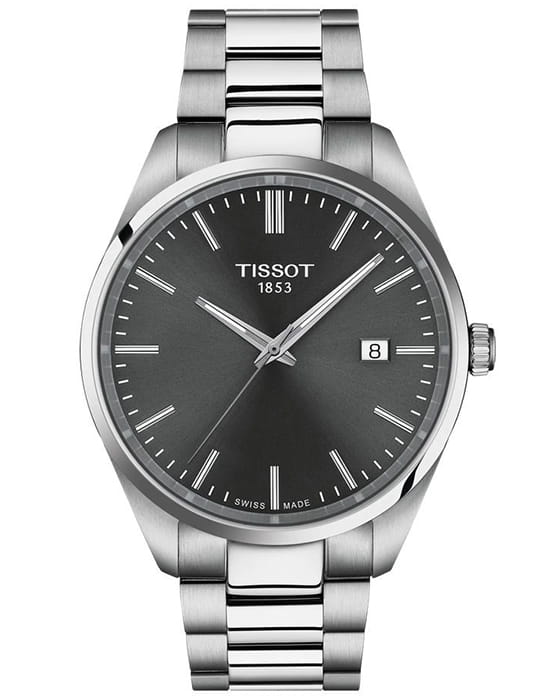 Tissot PR 100 40mm (T150.410.11.081.00) — классическая мужская модель, сочетающая строгий дизайн и швейцарскую надёжность. Корпус диаметром 40 мм изготовлен из нержавеющей стали, а элегантный чёрный циферблат с солнечным узором дополнен минималистичными метками и окошком даты на «3 часах». За точность отвечает швейцарский кварцевый механизм, а циферблат защищён сапфировым стекломСапфировое стеклоПрочный и надёжный материал из кристалла сапфира синтетического происхождения, характеризующийся особой твёрдостью и устойчивостью к царапинам и повреждениям., устойчивым к царапинам. Браслет из нержавеющей стали на застёжке «бабочка» с кнопкамиЗастёжка "бабочка"Такой вид застёжки дополняется предохранителями, помогающими избежать случайного раскрытия браслета. Обладают изящным исполнением. , что обеспечивает удобство и надёжность в ежедневной носке.