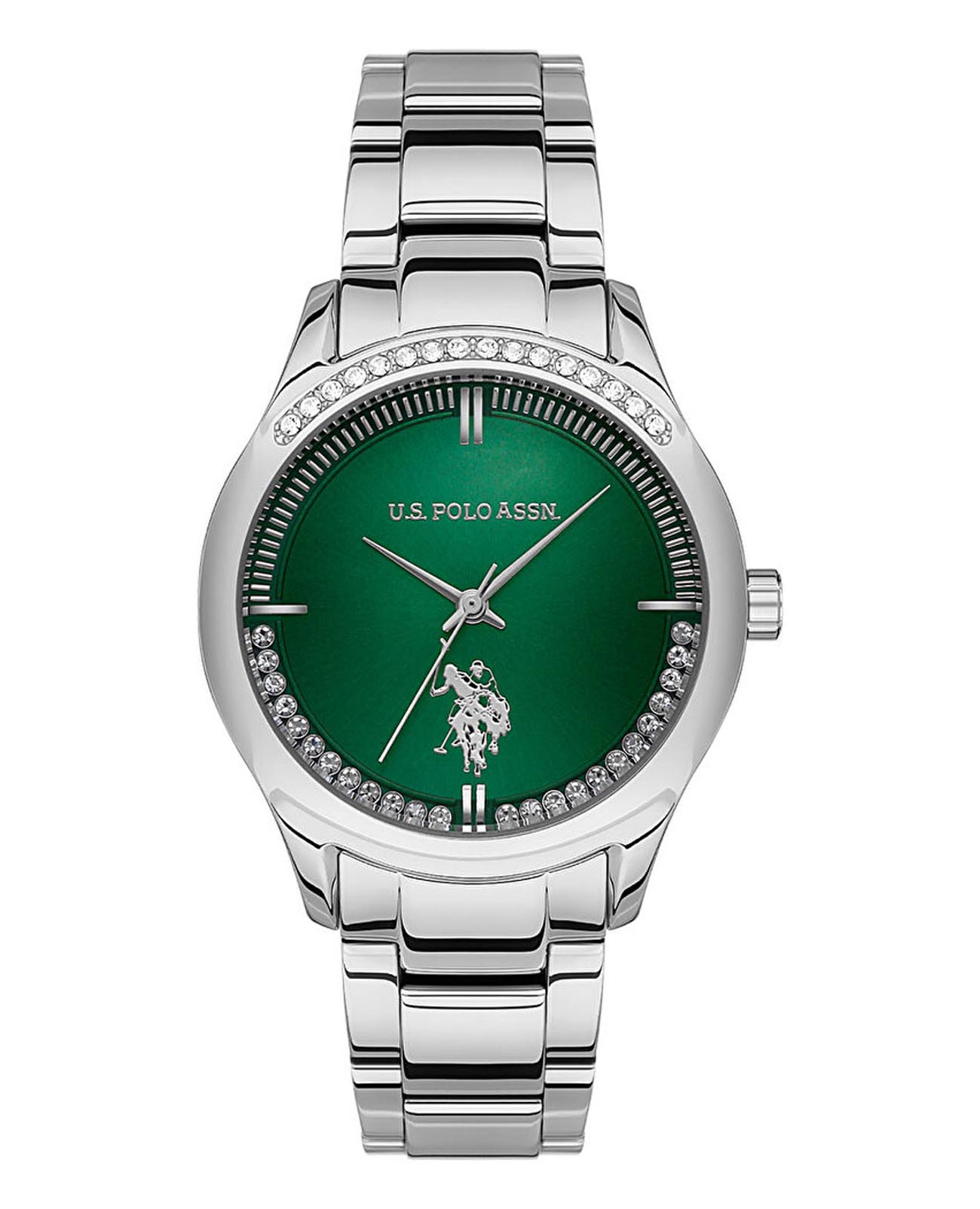 Женские часы U.S. Polo Assn Stile USPA2060-05, кварцевый механизм с высокой точностью. Минеральное стеклоМинеральное стеклоМинеральное стекло представляет собой искусственно выращенный минерал кварца. Такое стекло отличается особой устойчивостью к повреждениям и царапинам. Уступает по некоторым качествам сапфировому стеклу. устойчивое к появлению царапин, обладающее высокой прозрачностью. Корпус изготовлен из нержавеющей стали. БезельБезельВнешний ободок, закрепляющий стекло. В спортивных часах так называется поворотное кольцо с делениями на циферблате, выполняет роль таймера – замеряет отрезки времени на шкале. Неподвижный безель – элемент декора. Однонаправленно вращающийся безель на дайверских часах позволяет фиксировать моменты погружения и выныривания на поверхность. и циферблат украшены кристаллами. Окошко даты в положении 3 часа. Класс водозащиты: 30 метров, позволит защитить корпус от случайных брызг или капель дождя. Стальной браслет на раскладной застёжкеРаскладная застёжкаТакой тип застёжки используется только на браслетах из металла. Она никогда не раскрывается полностью, происходит разделение на 2 и более частей. Раскладывающая застёжка снизит вероятность потери часов к минимуму..