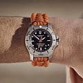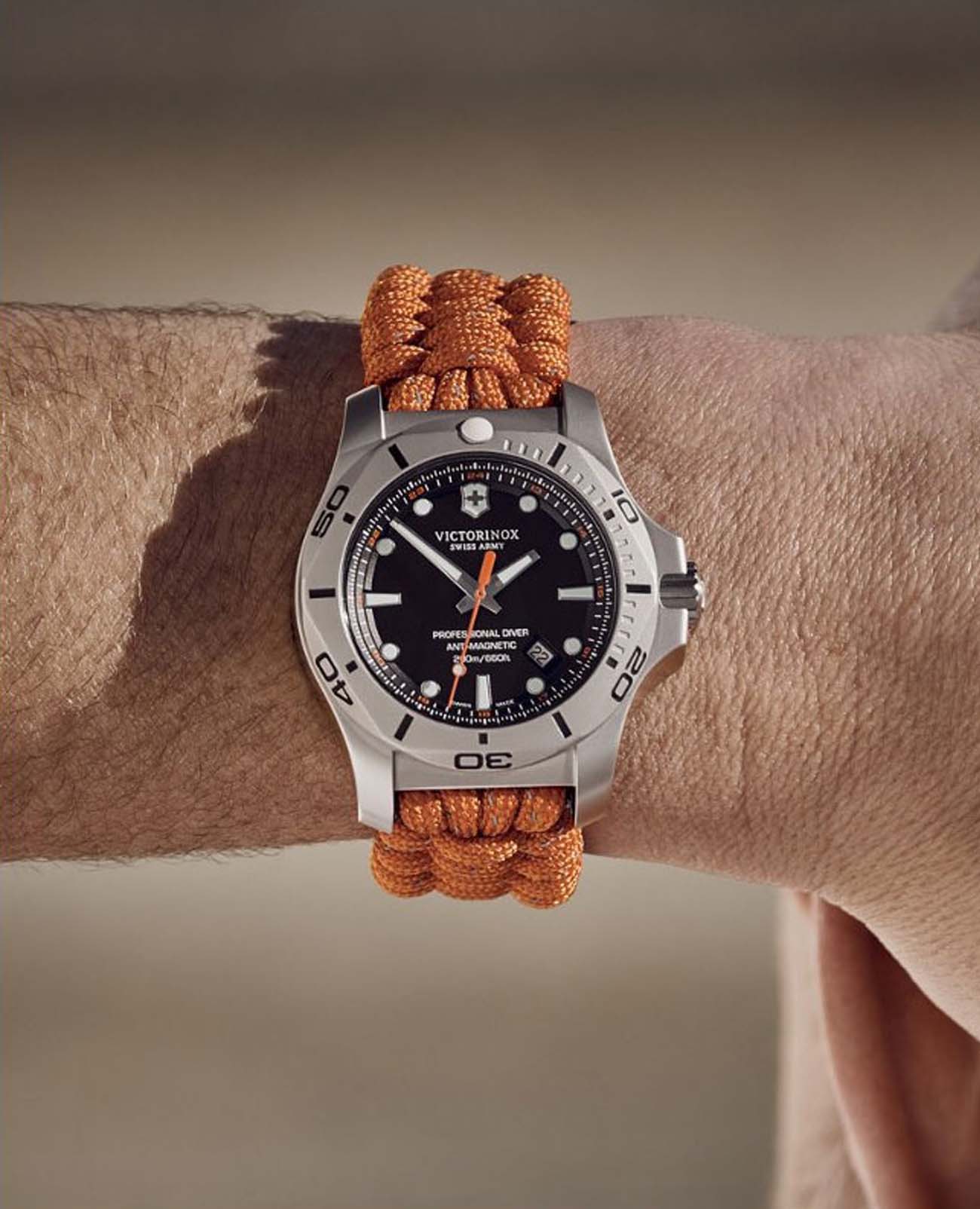 Мужские швейцарские часы Victorinox I.N.O.X. Professional Diver 241845. Сапфировое стеклоСапфировое стеклоПрочный и надёжный материал из кристалла сапфира синтетического происхождения, характеризующийся особой твёрдостью и устойчивостью к царапинам и повреждениям. с трёхслойным антибликовым покрытием. Корпус часов выполнен из карбона. Ремешок изготовлен из плетенной паракордовой стропы, длиной 2,5 метра и способной выдержать 250 кг. Влагозащита: 200 метров, позволит плавать, нырять и заниматься другими водными видами спорта. Окошко даты находится в положении между 4 и 5 часов. Стрелки и метки с люминесцентным покрытиемЛюминесцентное покрытиеПозволяет считывать показания времени в темноте. Производители наносят на стрелки, часовые индексы, безель или поверхность циферблата светонакопительный состав, дающий холодное свечение.. В комплекте съемный защитный бампер с увеличительным стеклом и резиновый ремешок.