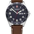 Мужские швейцарские часы Victorinox Fieldforce 241848 с надёжным кварцевым механизмом. Сапфировое стеклоСапфировое стеклоПрочный и надёжный материал из кристалла сапфира синтетического происхождения, характеризующийся особой твёрдостью и устойчивостью к царапинам и повреждениям. с трёхслойным антибликовым покрытием. Корпус часов выполнен из нержавеющей стали 316L. Практичный кожаный ремешок на стандартной застёжке. Влагозащита: 100 метров, позволит плавать, нырять и заниматься другими водными видами спорта. Окошко даты и дня недели находится в положении 3 часа. Стрелки и метки с люминесцентным покрытиемЛюминесцентное покрытиеПозволяет считывать показания времени в темноте. Производители наносят на стрелки, часовые индексы, безель или поверхность циферблата светонакопительный состав, дающий холодное свечение..