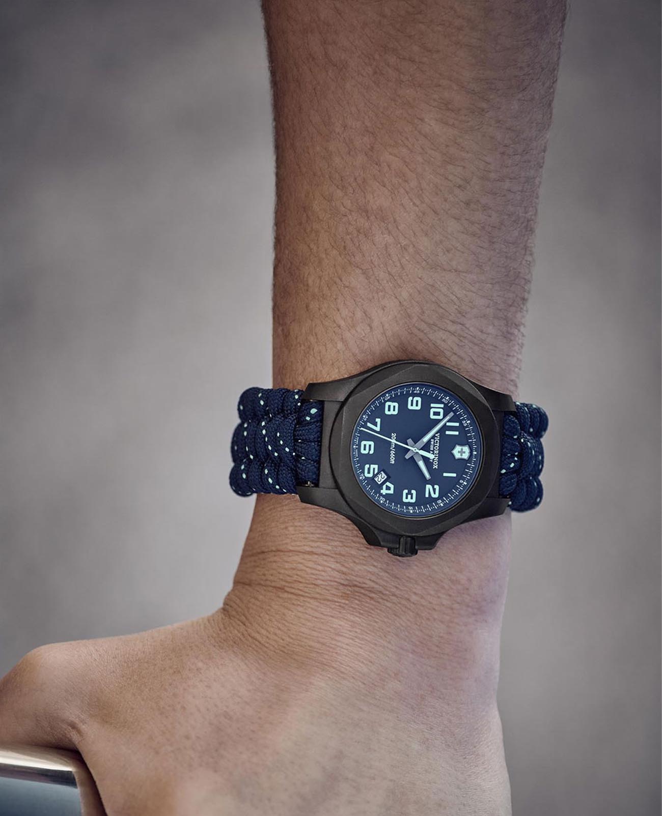 Мужские швейцарские часы Victorinox I.N.O.X. Carbon 241860. Сапфировое стеклоСапфировое стеклоПрочный и надёжный материал из кристалла сапфира синтетического происхождения, характеризующийся особой твёрдостью и устойчивостью к царапинам и повреждениям. с трёхслойным антибликовым покрытием. Корпус часов выполнен из карбона. Ремешок изготовлен из плетенной паракордовой стропы, длиной 2,5 метра и способной выдержать 250 кг. Влагозащита: 200 метров, позволит плавать, нырять и заниматься другими водными видами спорта. Окошко даты находится в положении между 4 и 5 часов. Стрелки и метки с люминесцентным покрытиемЛюминесцентное покрытиеПозволяет считывать показания времени в темноте. Производители наносят на стрелки, часовые индексы, безель или поверхность циферблата светонакопительный состав, дающий холодное свечение.. В комплект часов входят съемный защитный бампер и сменный каучуковый ремешок!