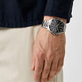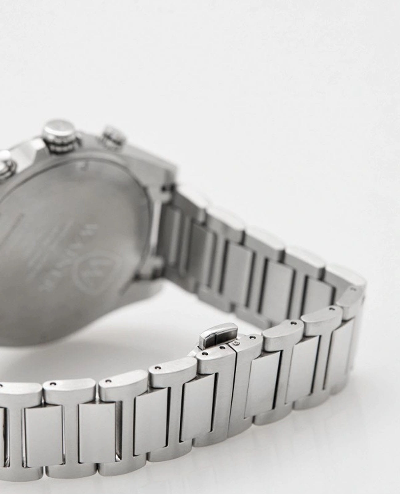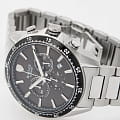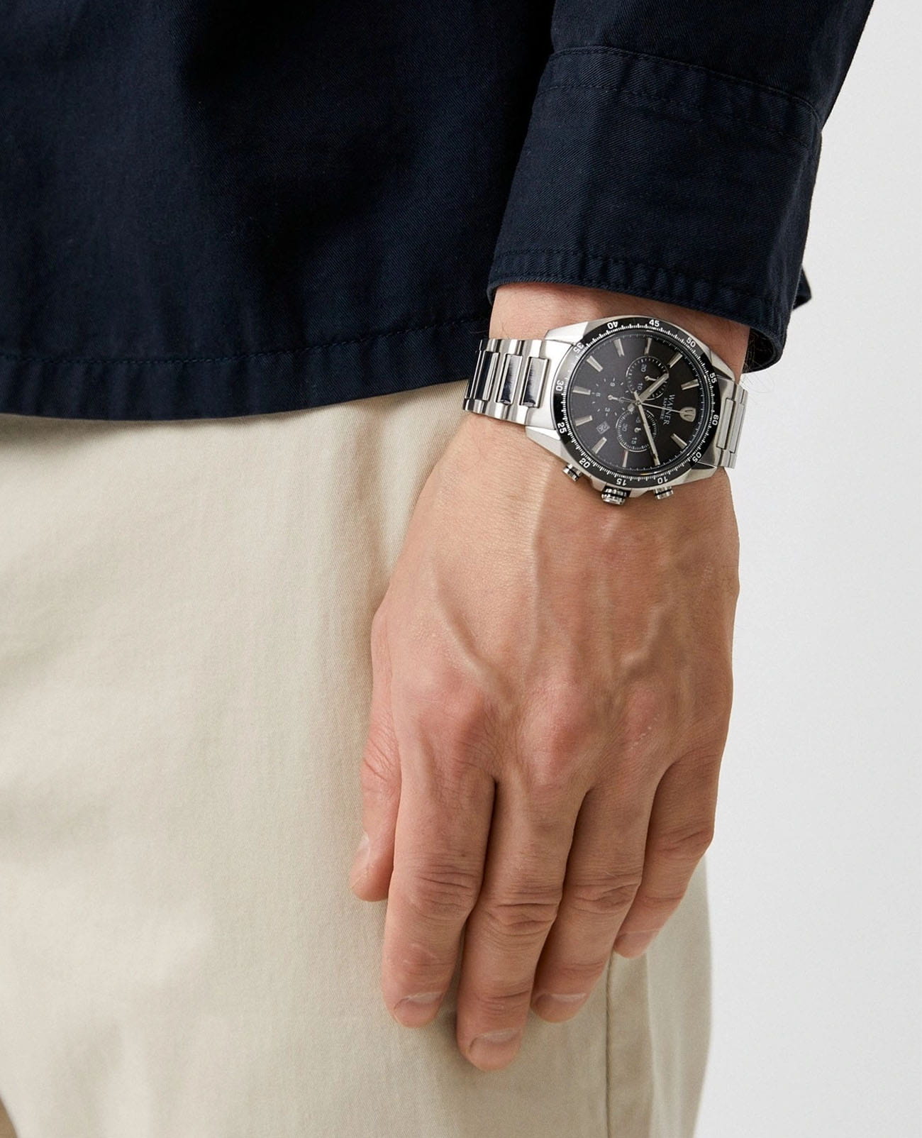 Мужские наручные часы-хронографХронографФункция позволяет измерять отрезки времени с особой точностью: часы, минуты, секунды. Верным признаком хронографа является наличие на циферблате 3 дополнительных окошек-счётчиков. WA.19300-A с надежным кварцевым механизмом. Корпус часов изготовлен из нержавеющей стали 316L. Стальной браслет на застёжке-бабочке с кнопкамиЗастёжка "бабочка"Такой вид застёжки дополняется предохранителями, помогающими избежать случайного раскрытия браслета. Обладают изящным исполнением. . Окошко даты находится в между 4 и 5 часами. Сапфировое стеклоСапфировое стеклоПрочный и надёжный материал из кристалла сапфира синтетического происхождения, характеризующийся особой твёрдостью и устойчивостью к царапинам и повреждениям.. Уровень водозащиты: 100 метров, позволит плавать, нырять и заниматься другими водными видами спорта. БезельБезельВнешний ободок, закрепляющий стекло. В спортивных часах так называется поворотное кольцо с делениями на циферблате, выполняет роль таймера – замеряет отрезки времени на шкале. Неподвижный безель – элемент декора. Однонаправленно вращающийся безель на дайверских часах позволяет фиксировать моменты погружения и выныривания на поверхность. с PVD-покрытиемPVDУльтратонкое покрытие наносится в технике вакуумного напыления, сочетает в себе нитрид титана особой прочности со слоем золота или оксида хрома. Несёт в себе декоративную или защитную функцию.. Стрелки с люминесцентным покрытиемЛюминесцентное покрытиеПозволяет считывать показания времени в темноте. Производители наносят на стрелки, часовые индексы, безель или поверхность циферблата светонакопительный состав, дающий холодное свечение..